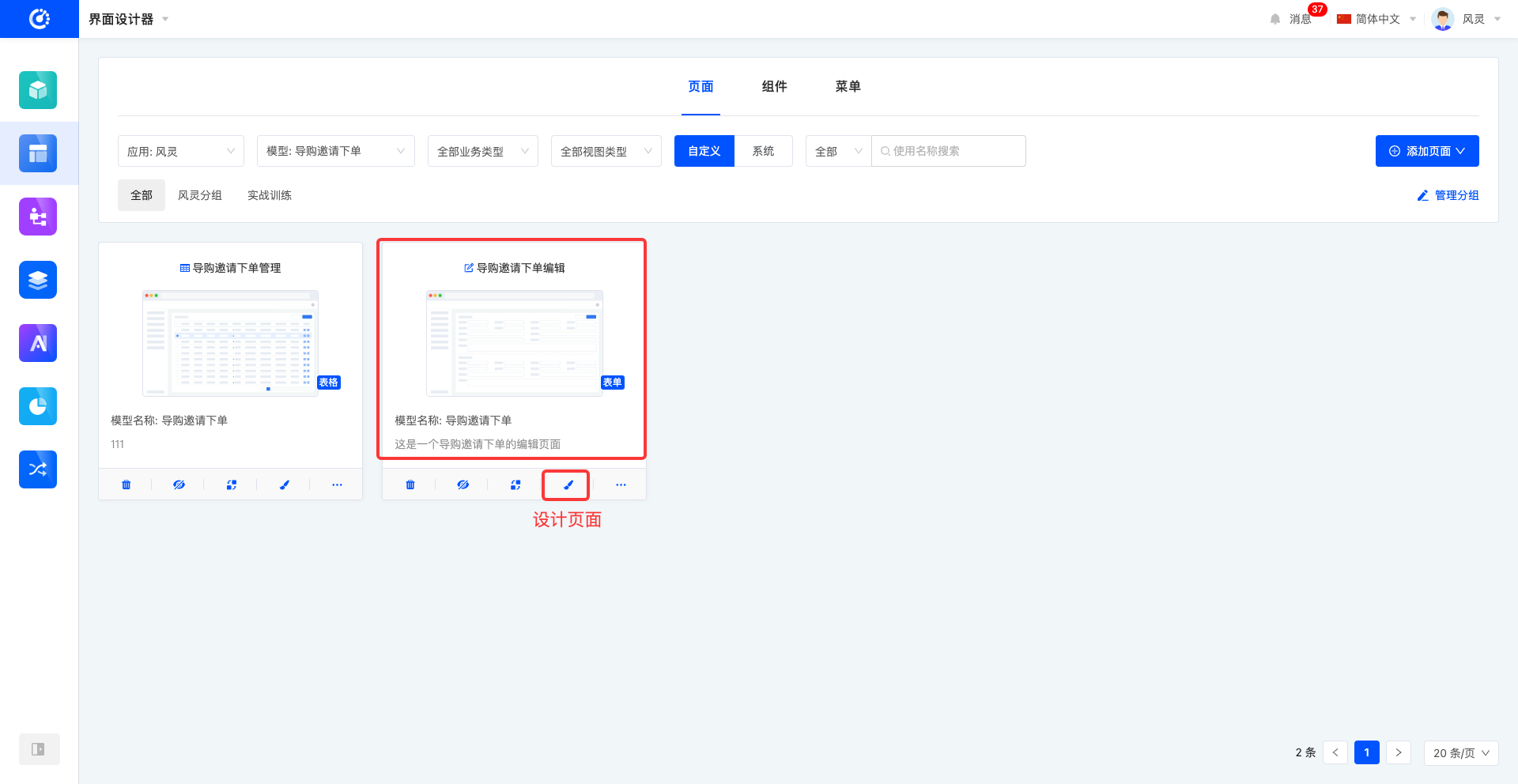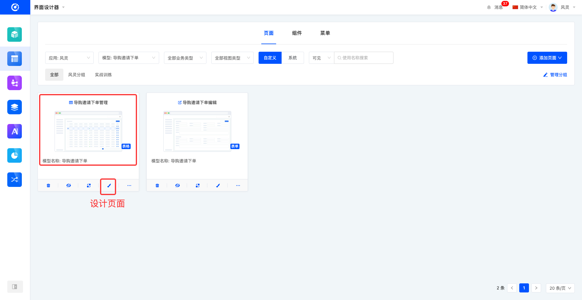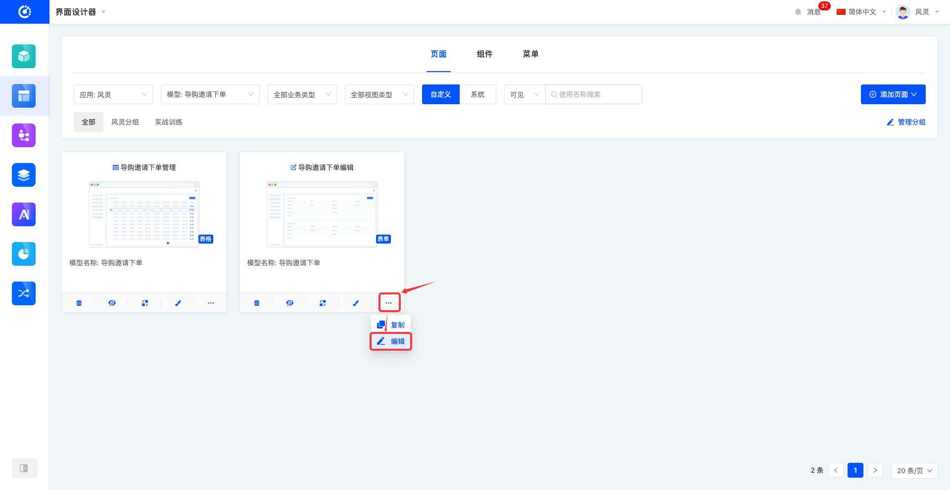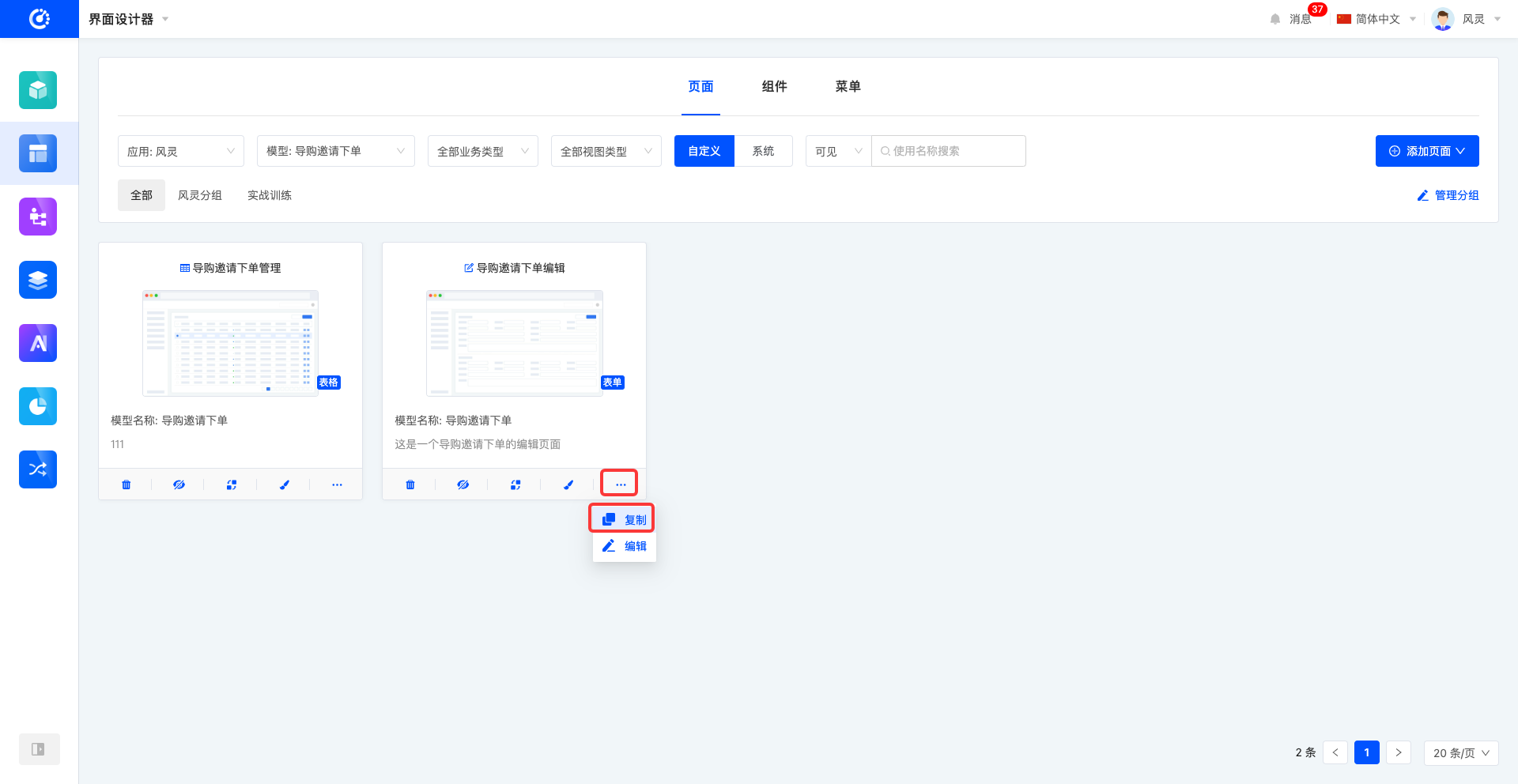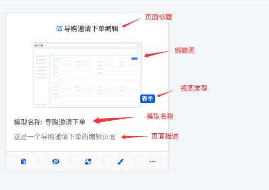 在界面设计器中,默认以卡片形式呈现页面列表。页面卡片上可预览到页面的基本信息,包括页面标题、页面缩略图、视图、页面对应模型名称、页面描述。