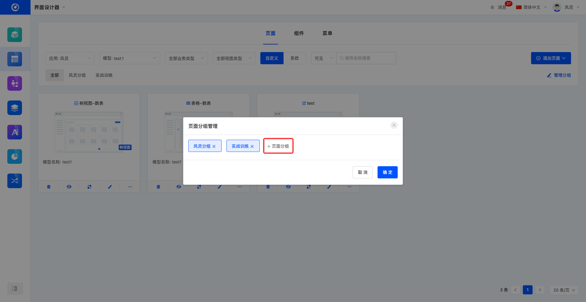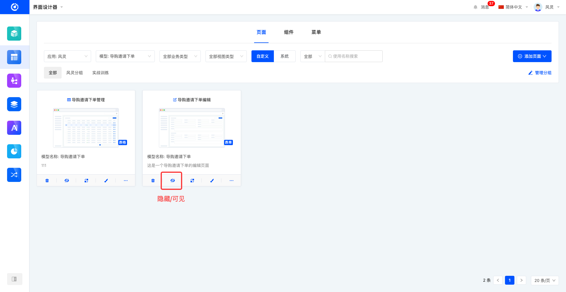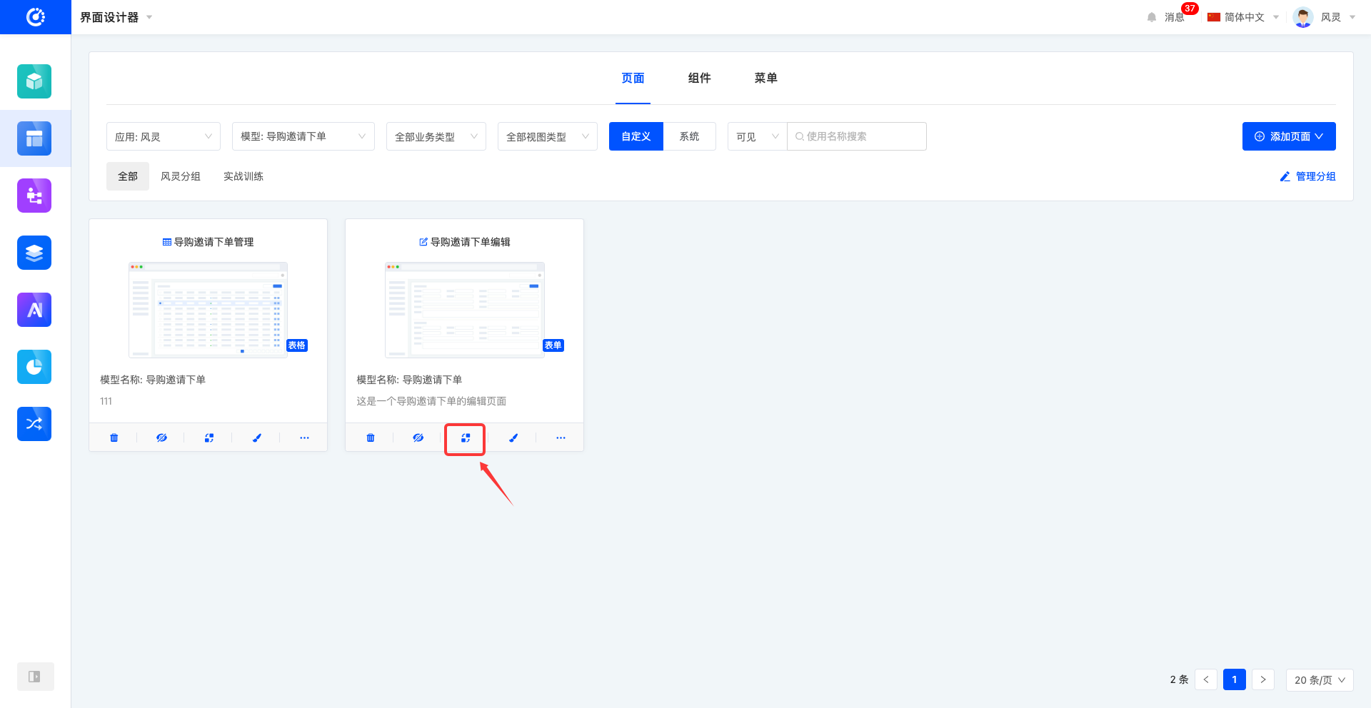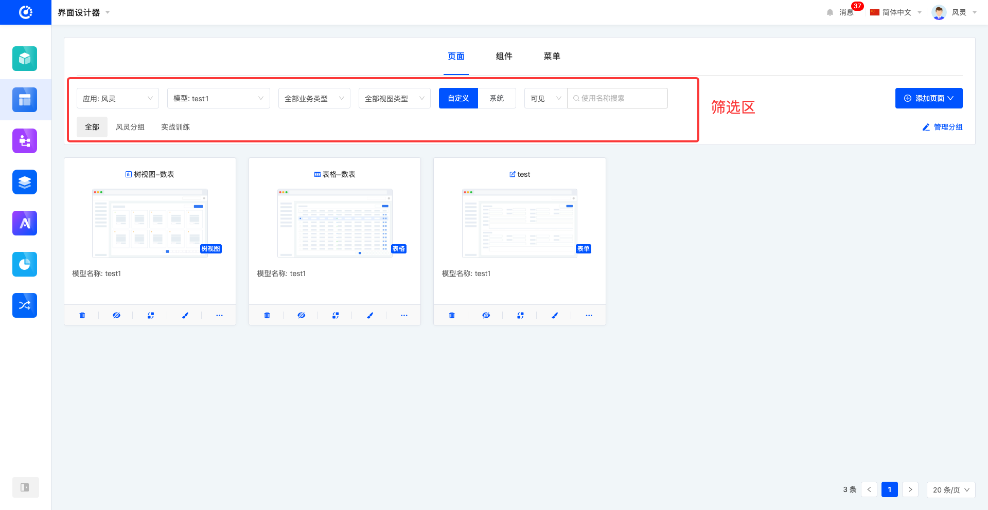 在界面设计器中,默认以卡片形式呈现页面列表。页面卡片上可预览到页面的基本信息,包括页面标题、页面缩略图、视图、页面对应模型名称、页面描述。