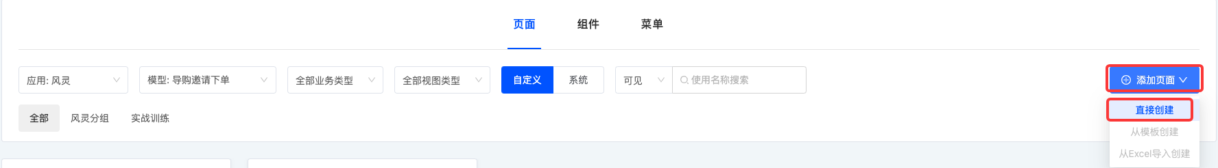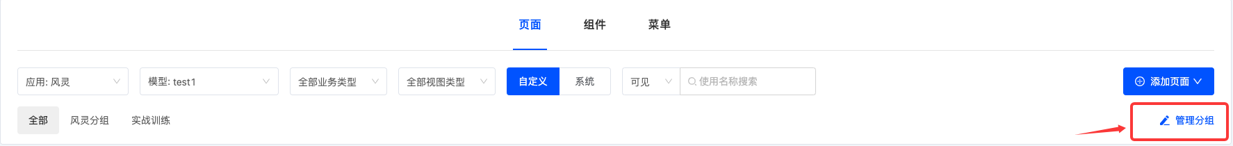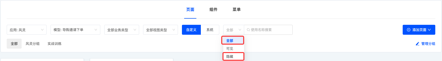 根据实际业务需求,可以定制页面筛选条件,包括所属应用/模块、模型、业务类型、视图类型及分组设置等,以便对页面进行精确筛选。在当前的筛选条件下,将展示相应的页面列表,方便对不同页面进行设计和编辑操作。