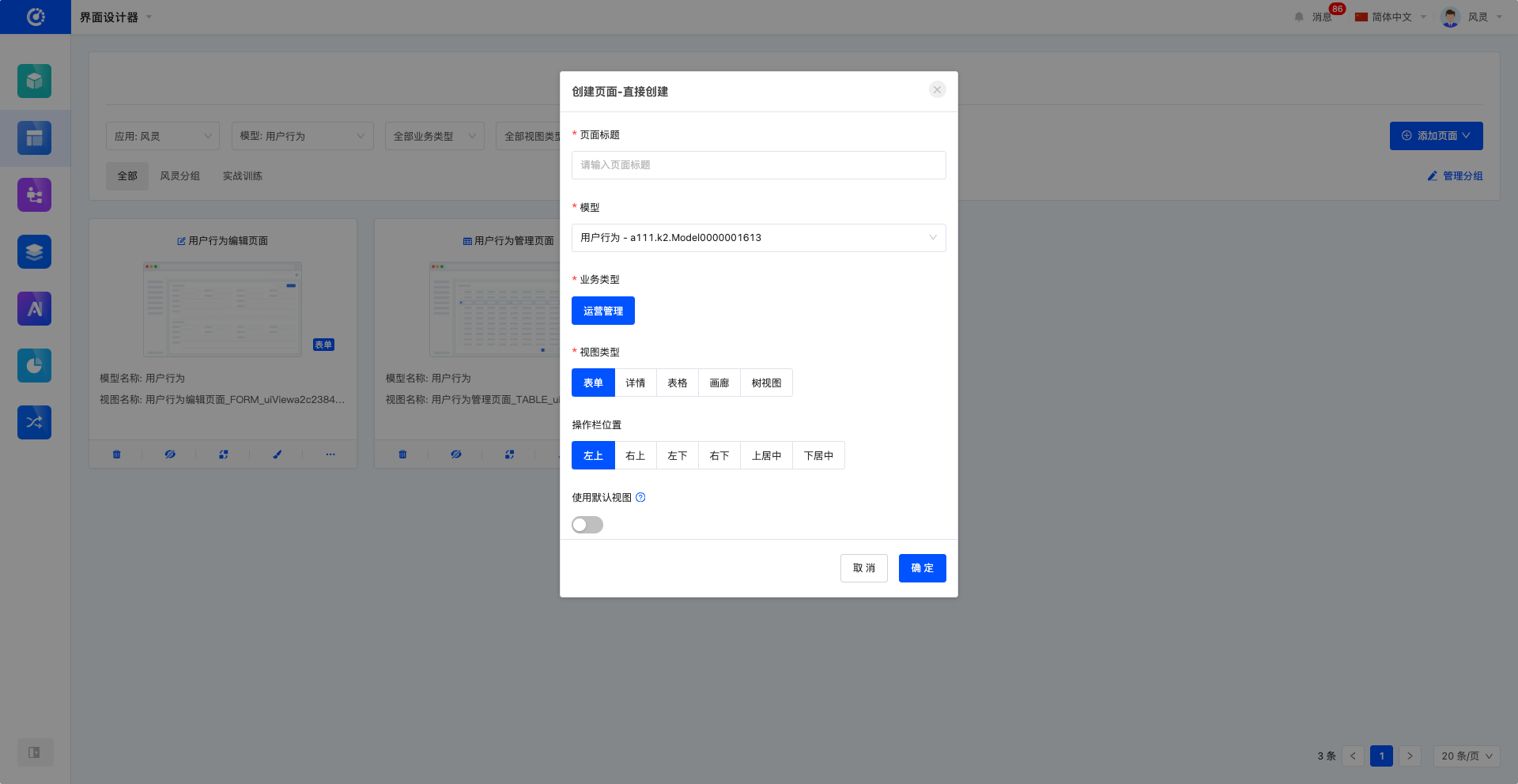 在创建页面时,若启用“使用默认视图”选项,系统将根据模型信息与视图类型自动生成一个默认视图,从而简化页面设计的步骤。启用该选项后,还可以选择默认宽度,即设定生成默认视图中组件在页面上所占的默认大小。
