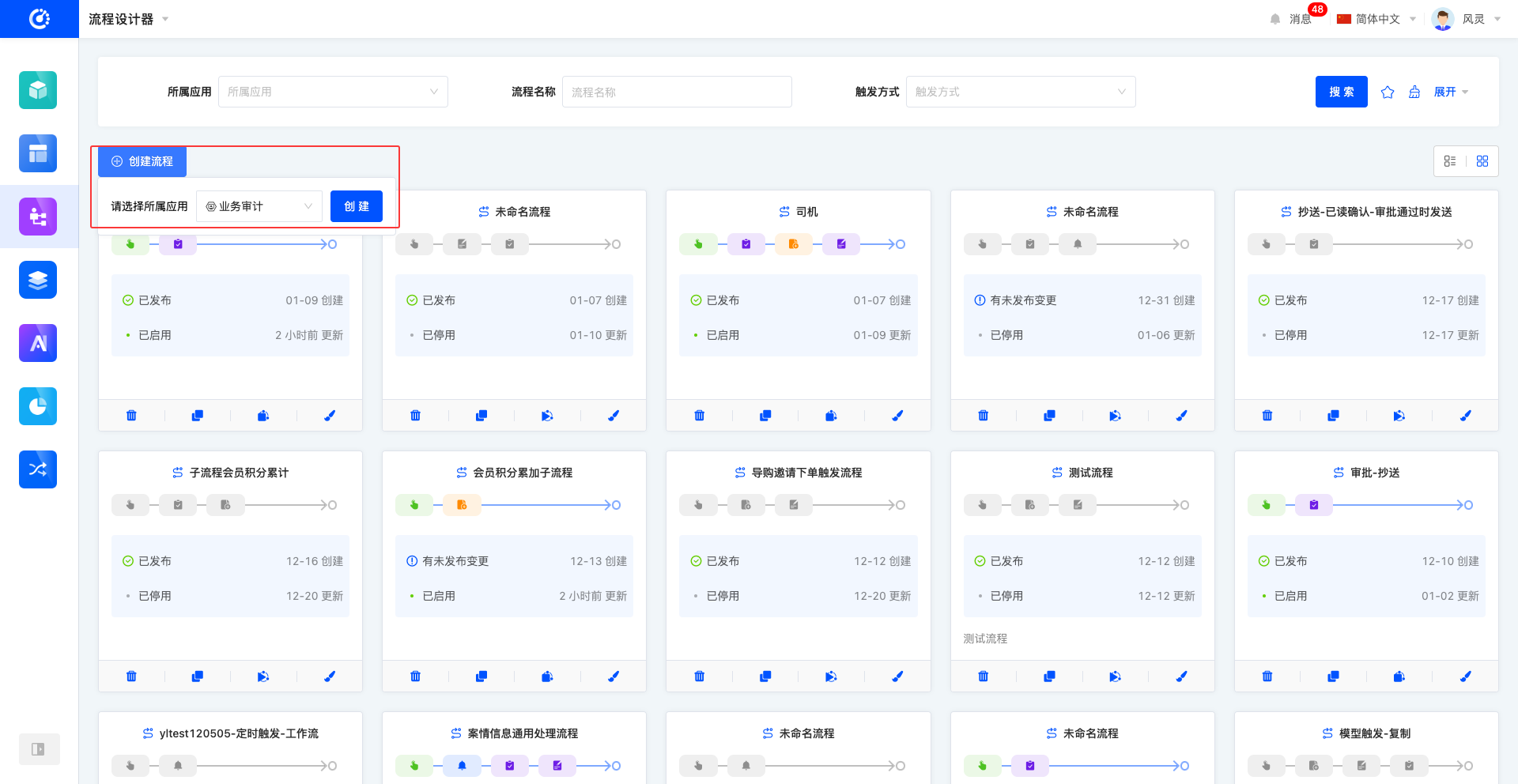 根据实际业务需求,可以定制流程筛选条件,包括所属应用、流程名称、触发方式、启用状态、更新状态。在当前的筛选条件下,将展示相应的流程列表,方便对不同的流程进行设计和编辑操作。