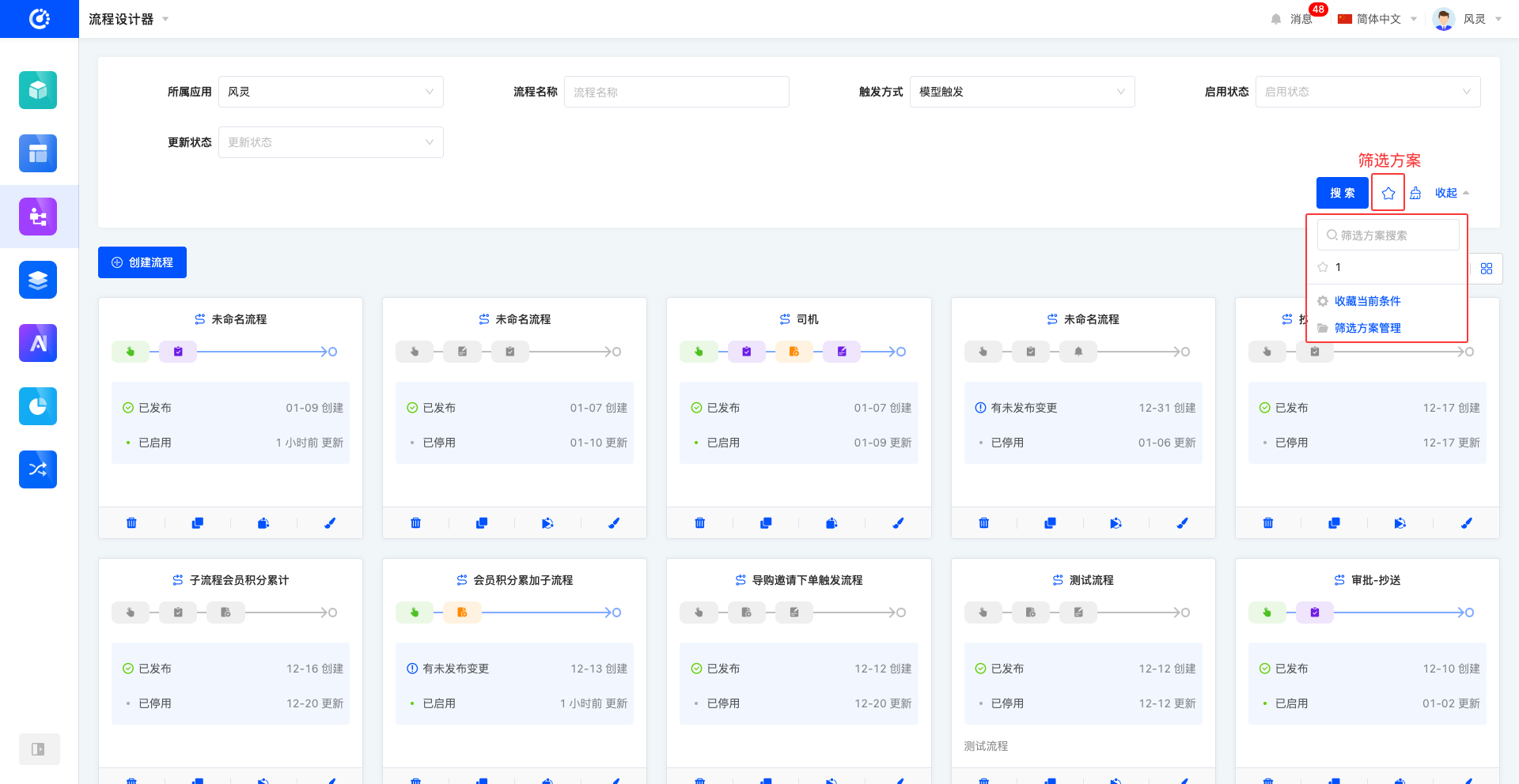 对于常用的筛选项组合,可以将其收藏进筛选方案,之后可直接在筛选方案中一键选择对流程进行筛选。