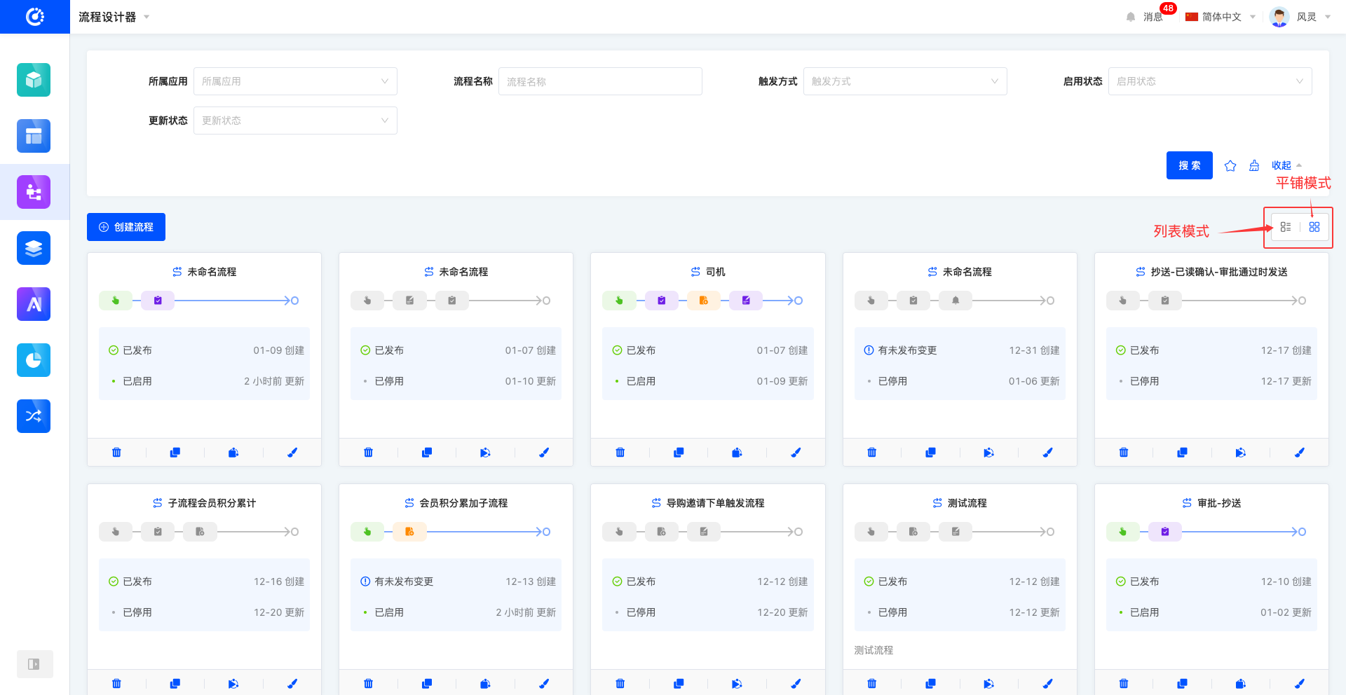 - 平铺模式:以卡片形式直观呈现流程信息,包括流程名称、流程简要示意图以及发布与启用状态。