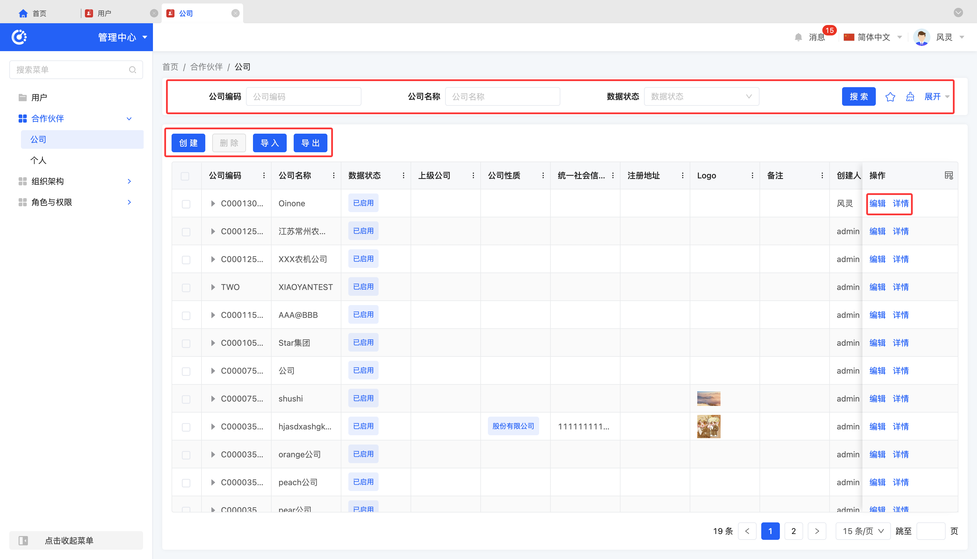支持管理公司合作伙伴的公司信息,包括公司名称、公司性质等。