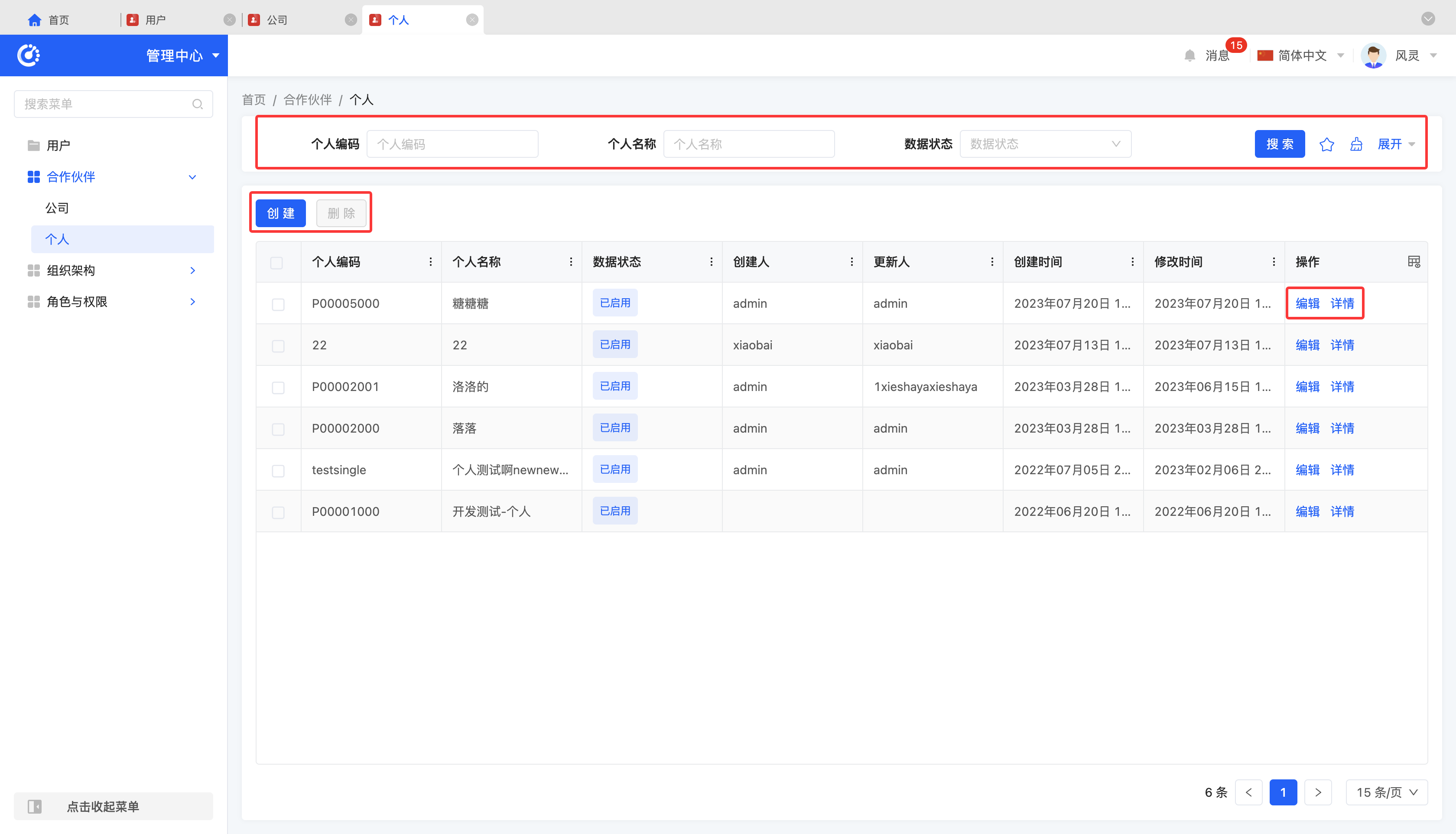 支持管理合作伙伴中的个人信息,包括姓名、编码等。