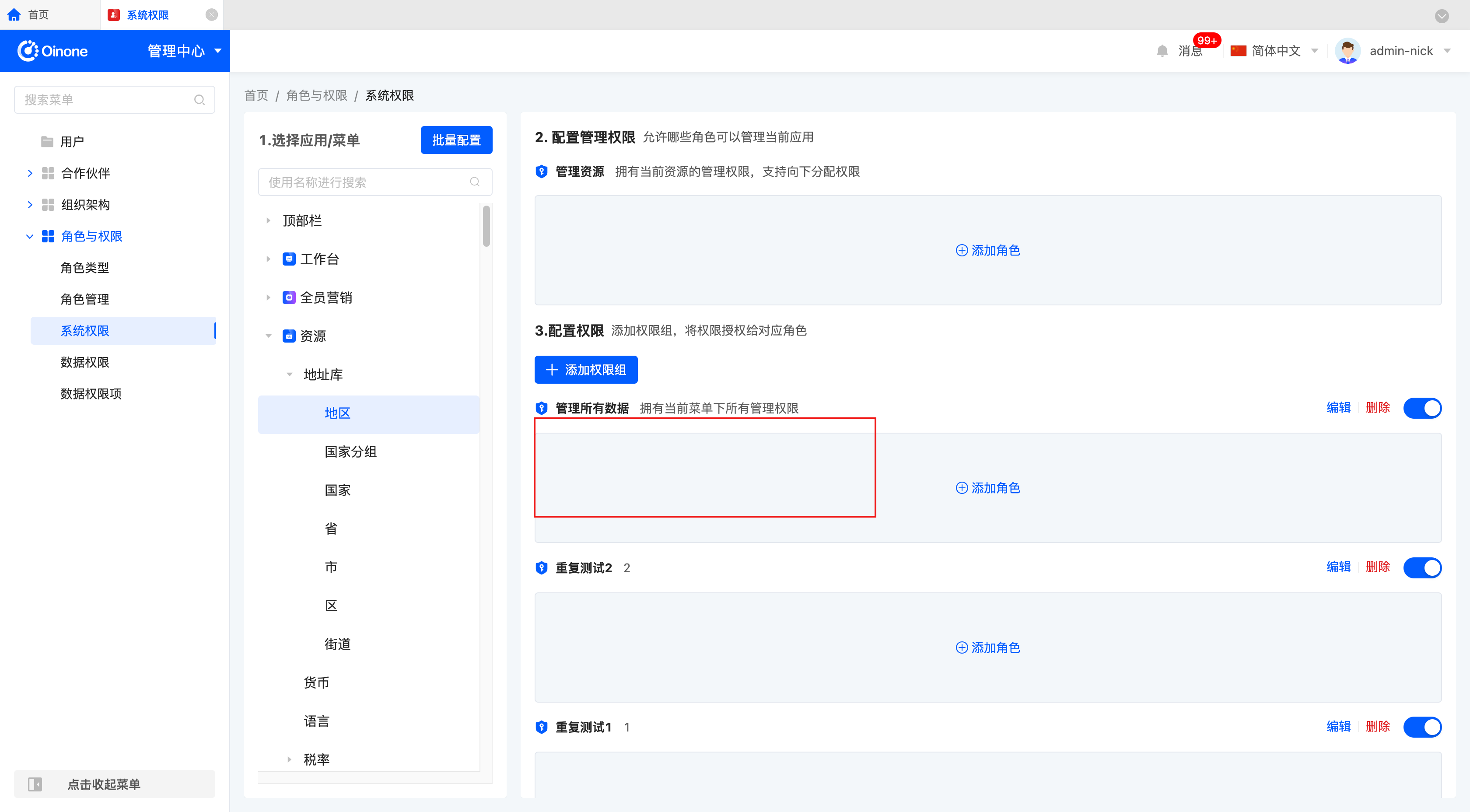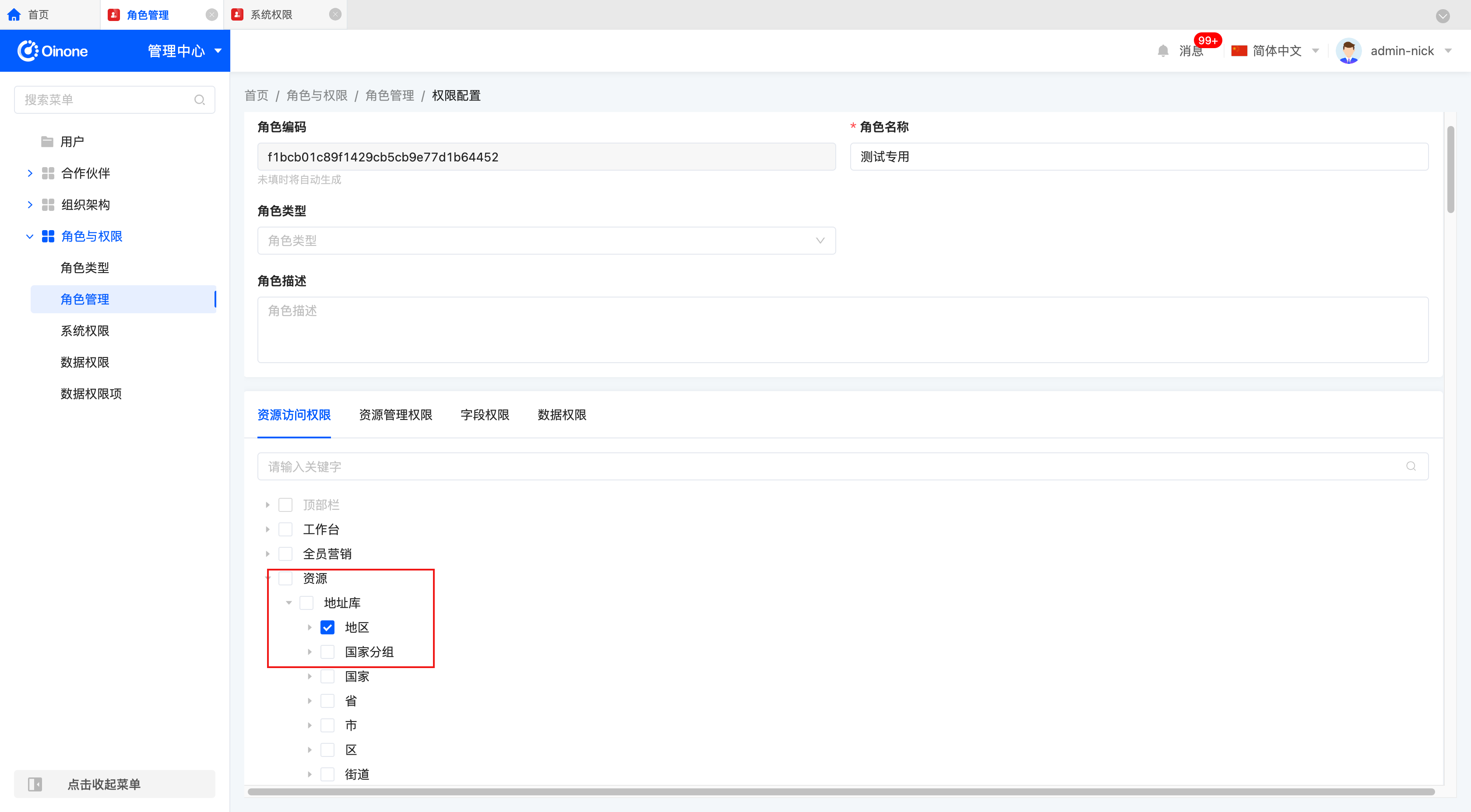 - 首先,我们在“系统权限”中为“资源-地址库-地区”添加“测试专用”角色。