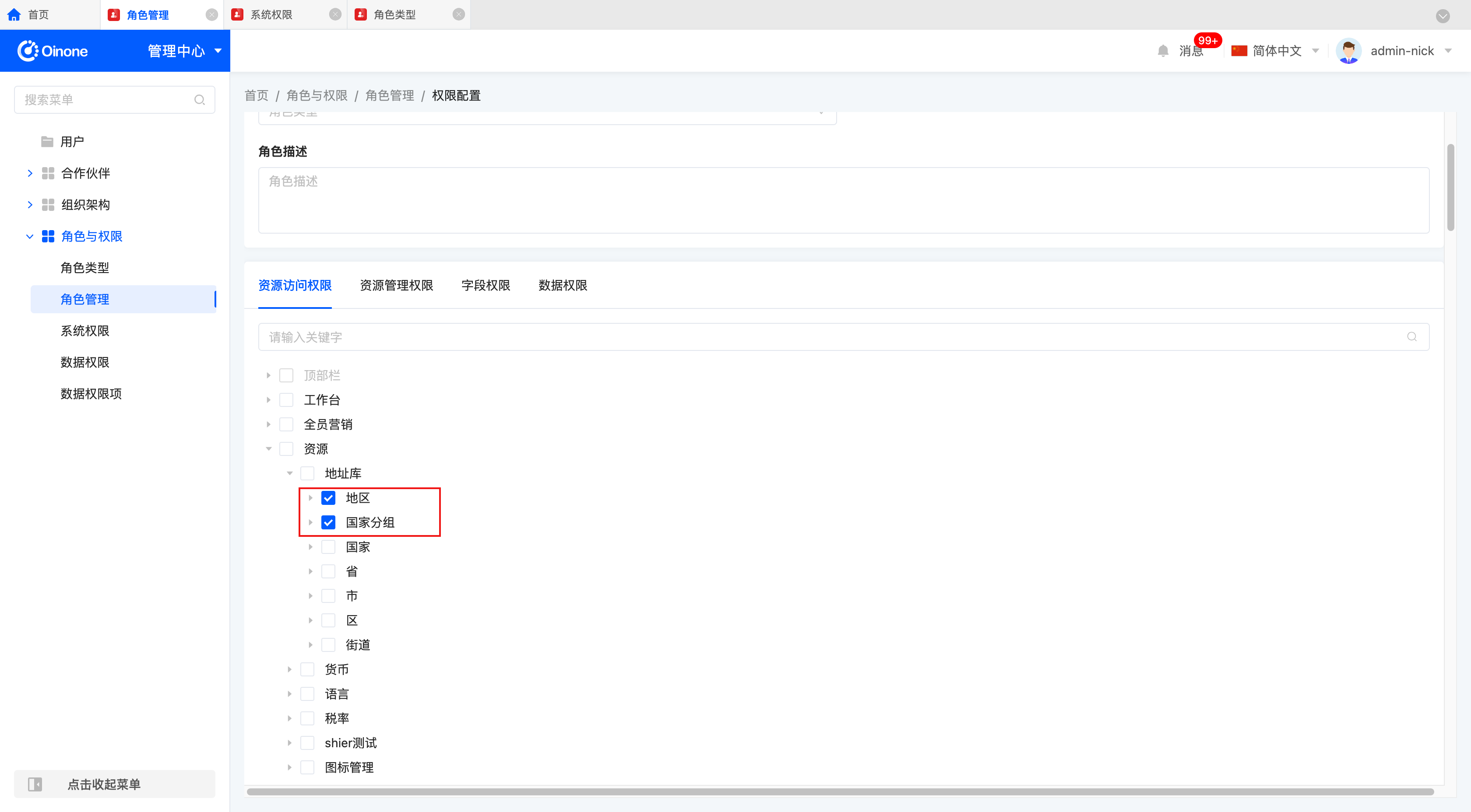 要想使资源管理权限生效,首先该角色需要具备“管理中心”的访问权限