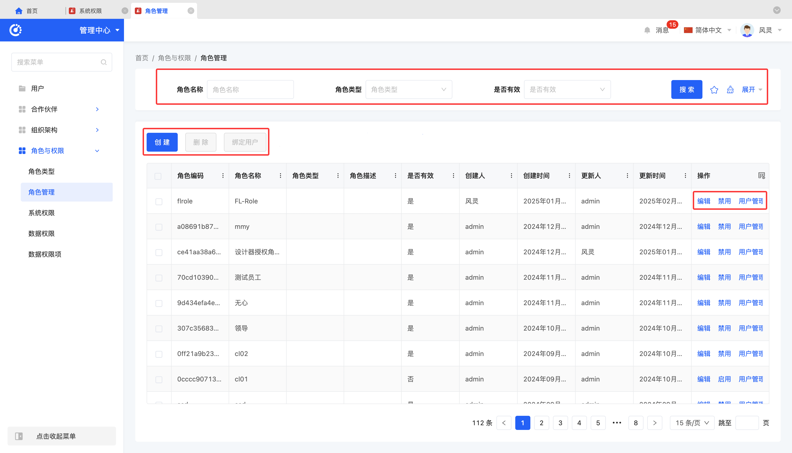 - 用户管理:点击「用户管理」或选中角色后点击「绑定用户」,可为选中角色统一配置多个用户