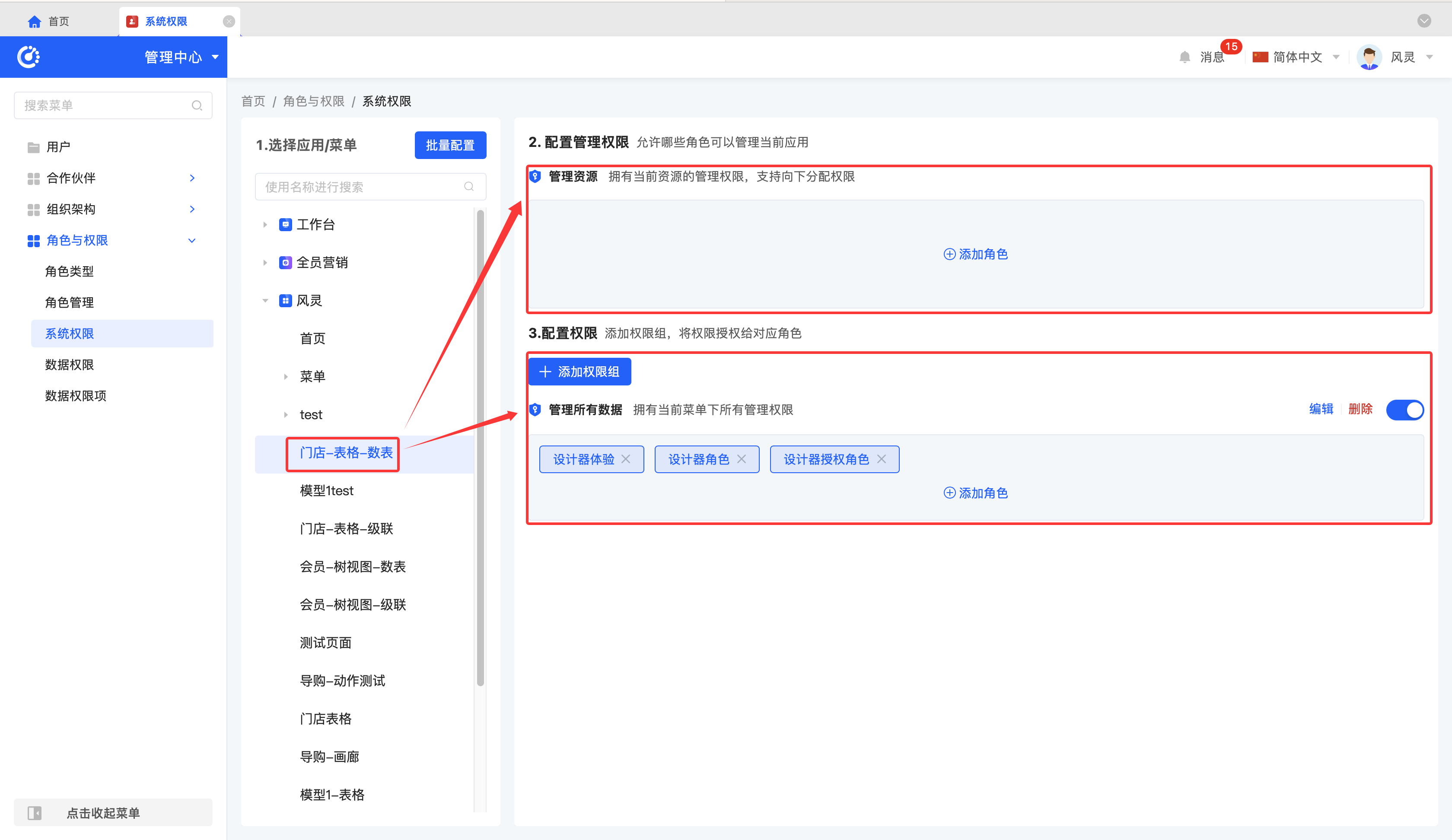 - 若角色配置已基本定型,仅需新增应用或菜单权限,使用「系统权限」操作更快捷。