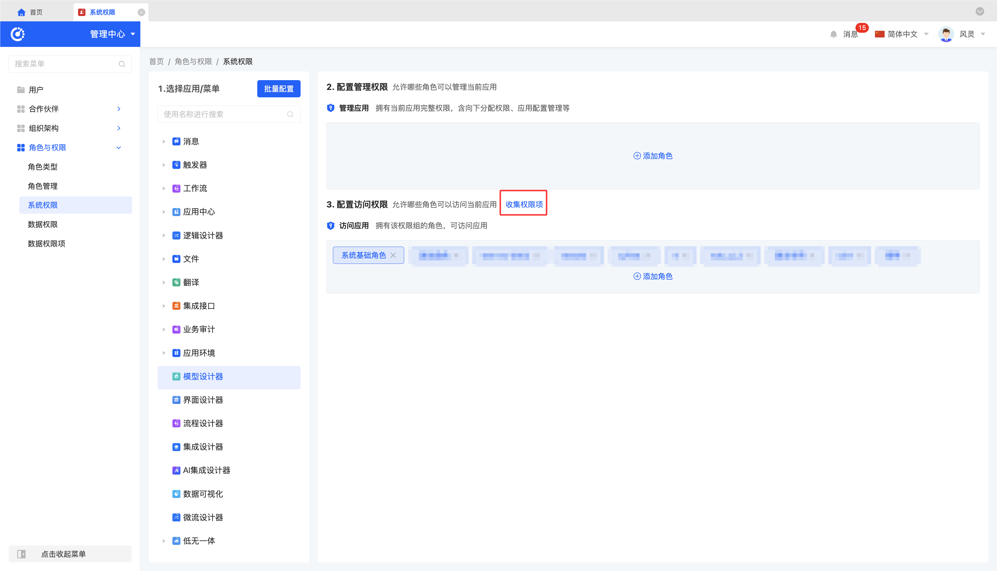 - 收集新权限:点击「收集新权限」,即可为设计器增加新功能权限