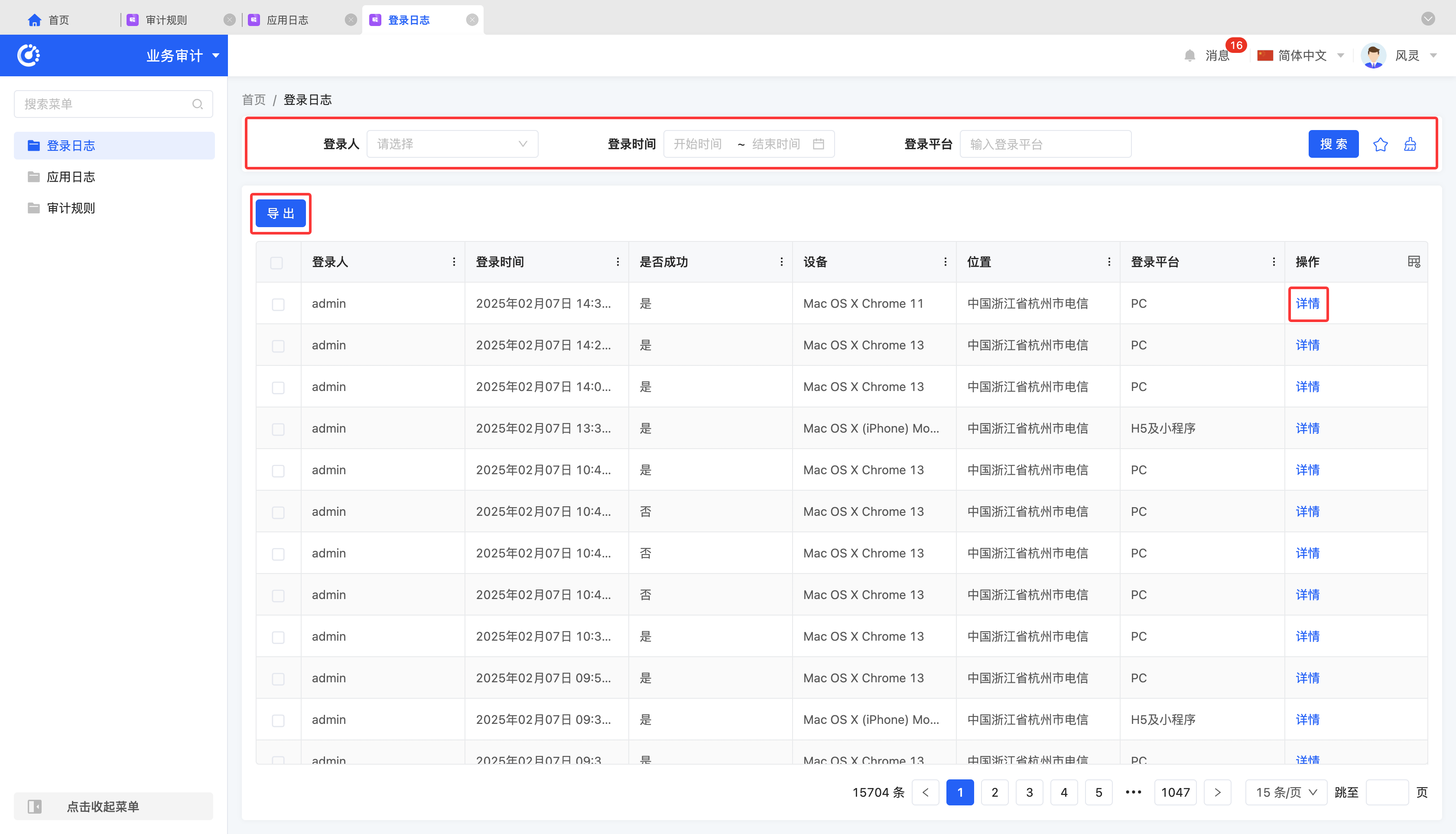 - 导出:支持导出登录日志,可以选择使用预设的导出模板,也可以根据实际需求自定义导出字段。