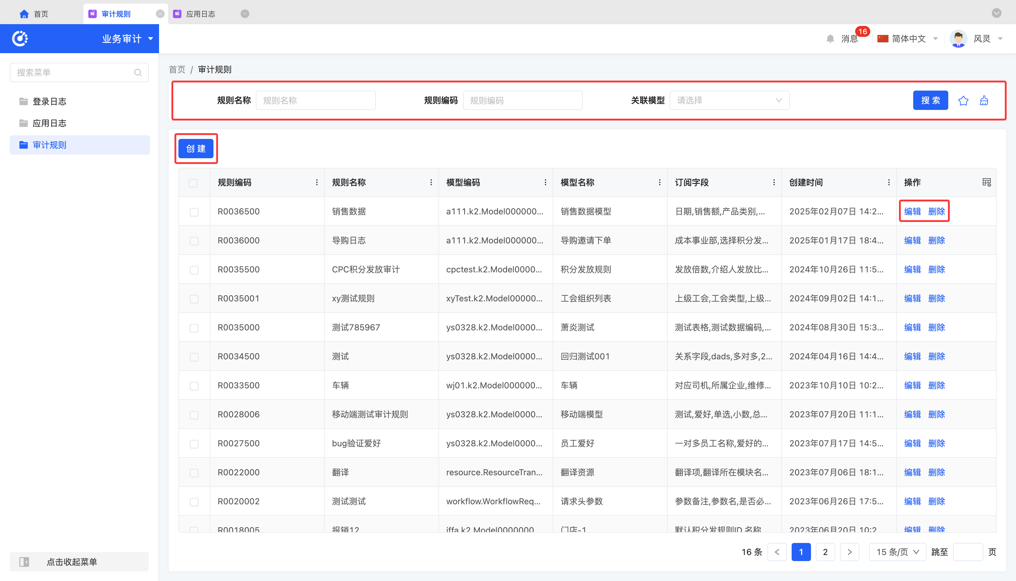 - 删除:选中某一审计规则后,点击「删除」,即可将该审计规则删除。