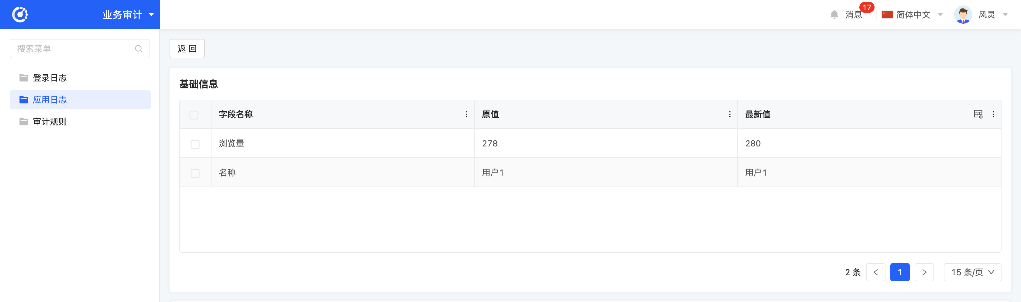 若以该模型生成的页面中使用了“日志记录”组件,那么在页面中选择具体数据来查看其变更信息。其变更信息会根据审计规则来进行记录,同应用日志
