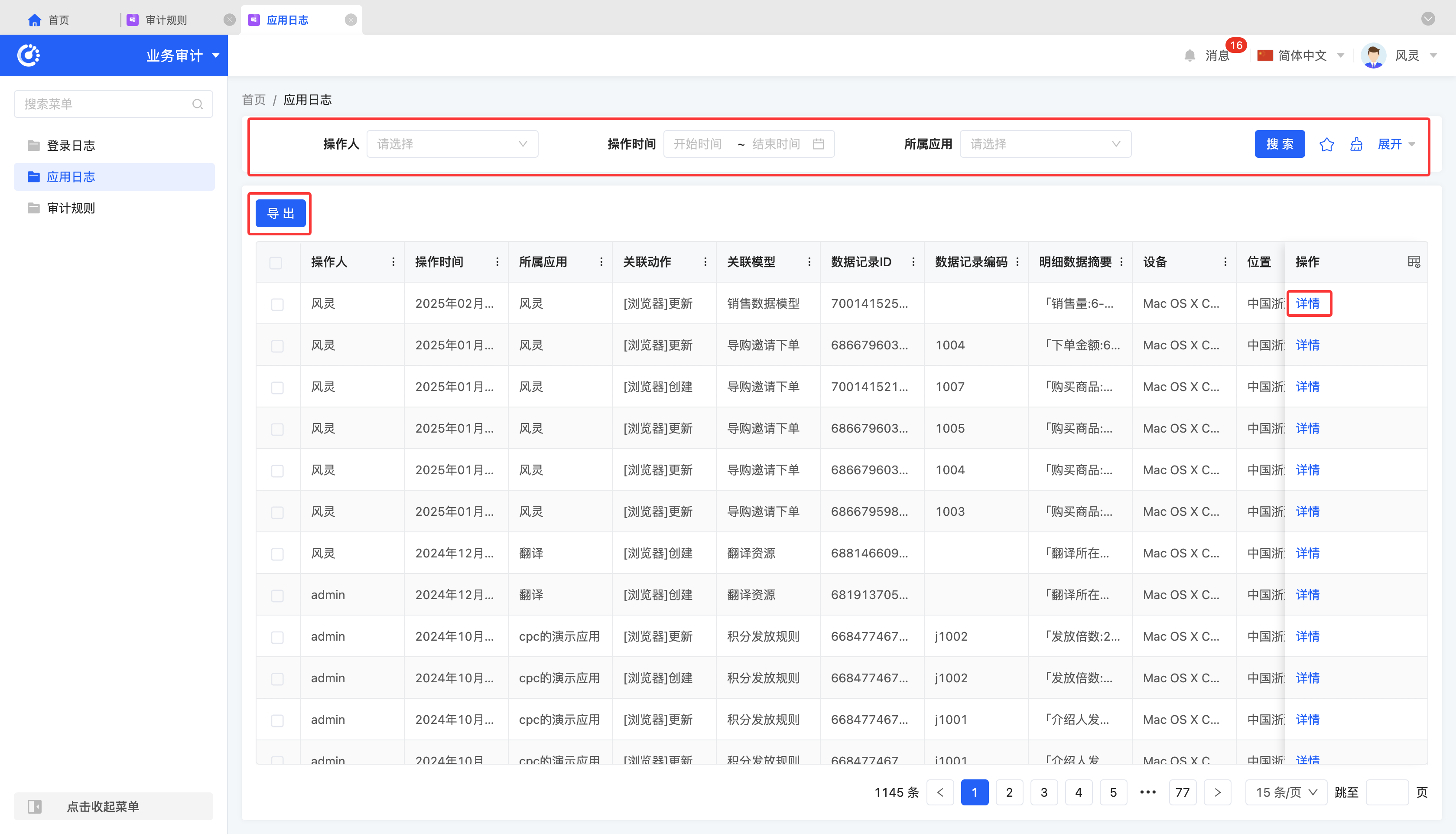 系统会根据审计规则所定义的模型与字段的内容变化,自动生成应用日志,详细记录用户的操作信息。