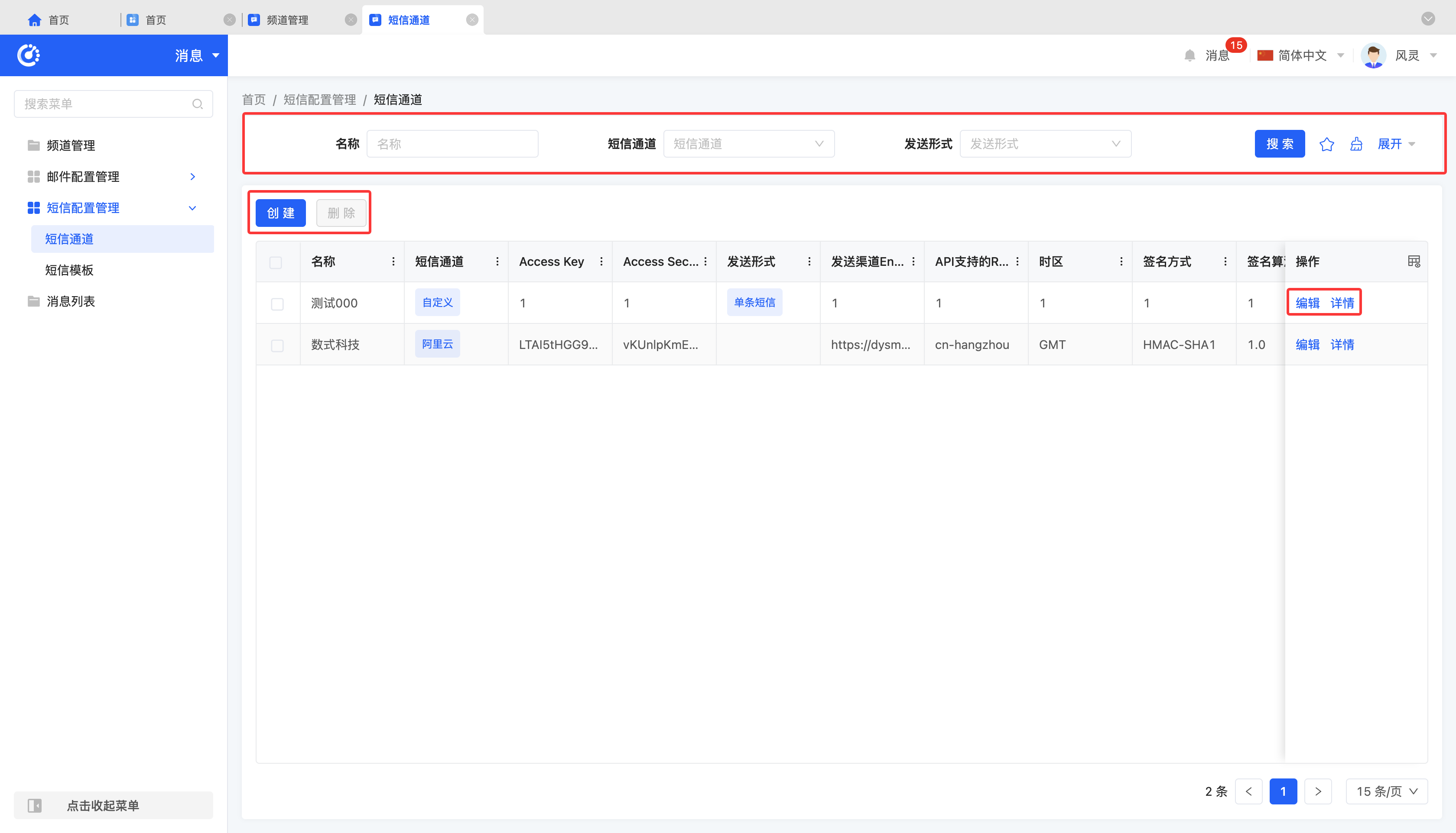 - 删除:选中某一短信通道后,点击「删除」,即可将该短信通道删除。