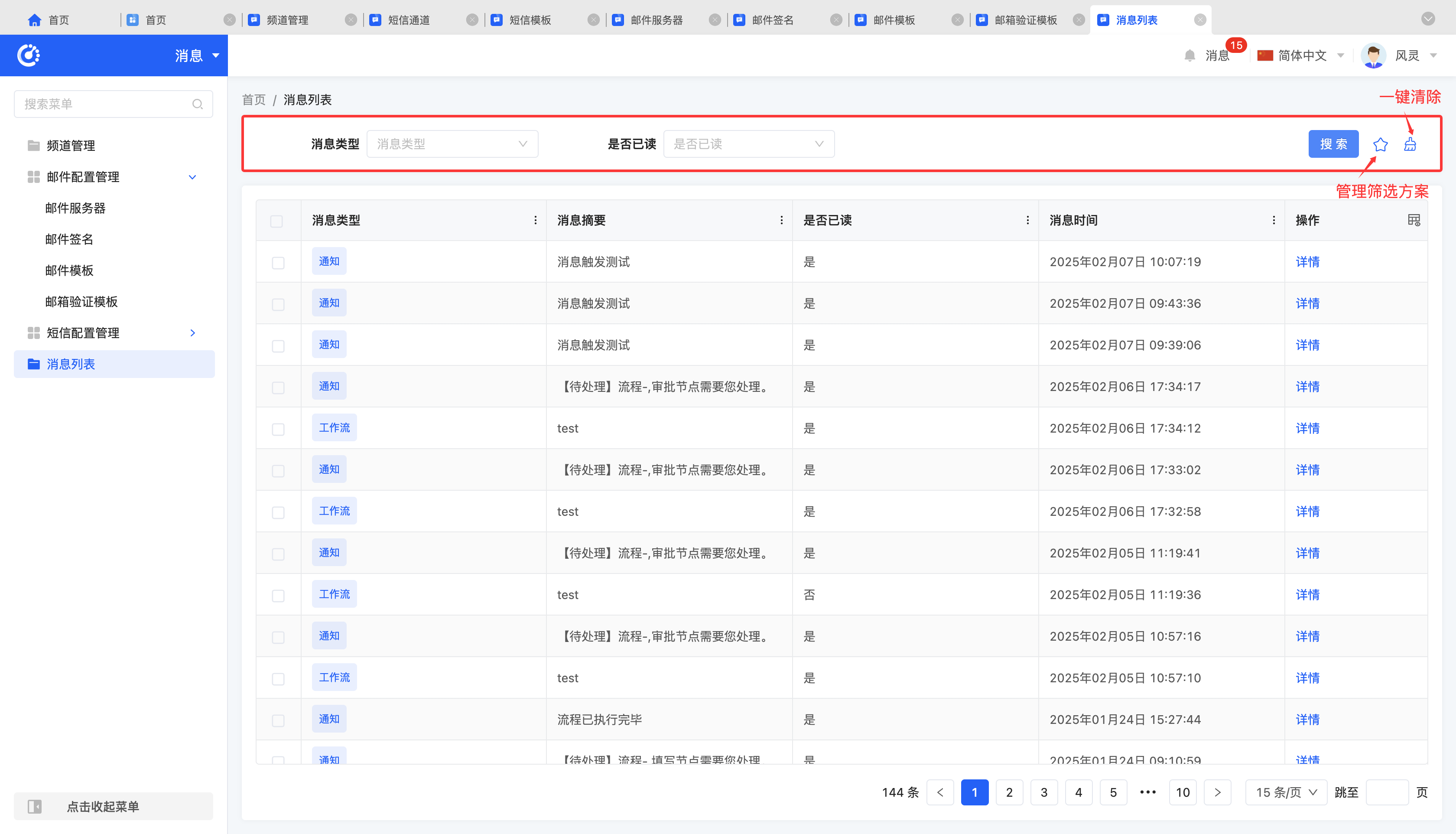 根据实际业务需求,可以定制消息列表的筛选条件。在当前的筛选条件下,将展示相应的消息列表,方便查看不同的消息记录。