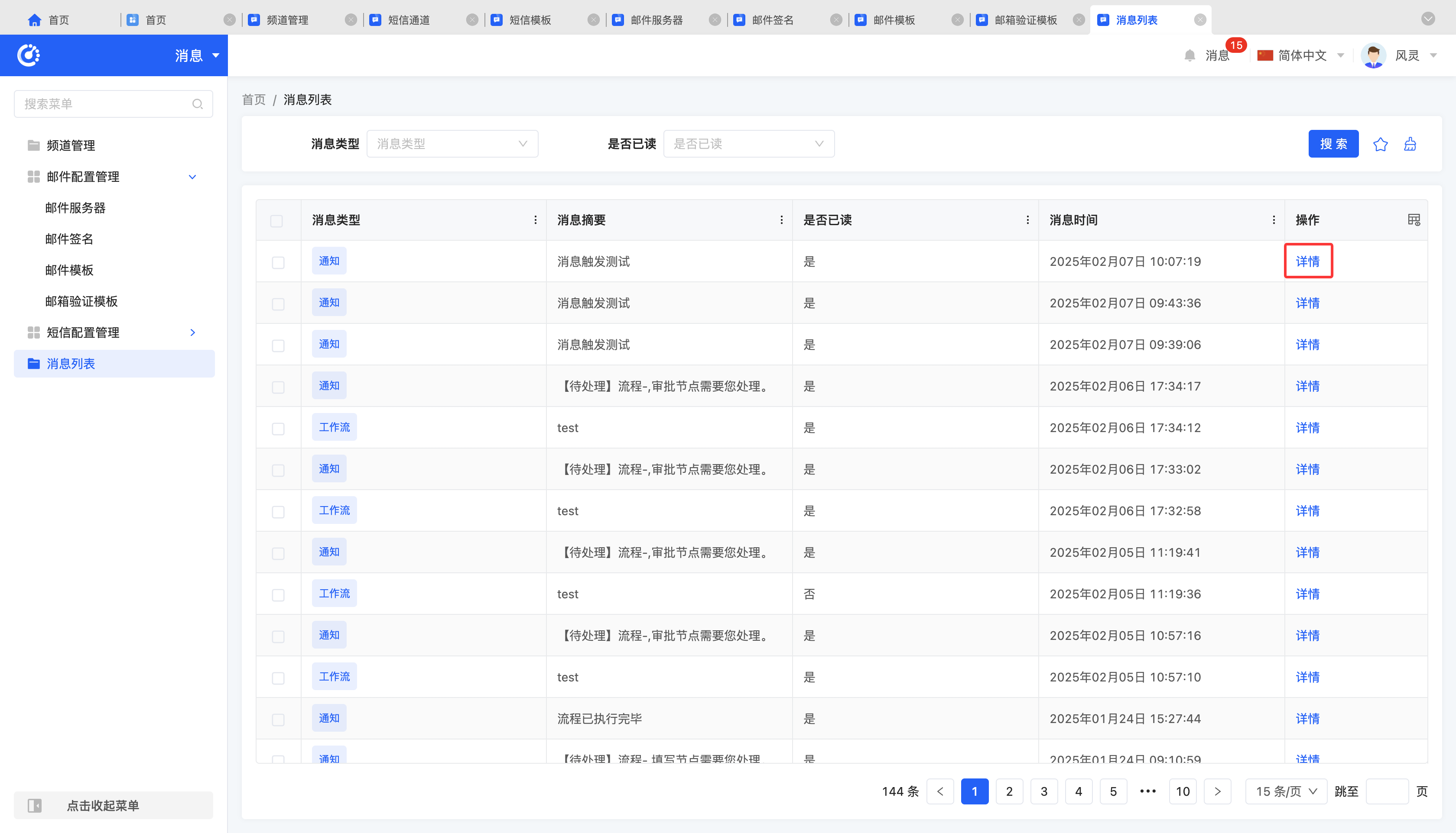 消息列表用于详细记录平台各类消息的执行情况,涵盖了通知、工作流、抄送等多种消息类型。每当系统内发生一次消息传递时,都会在消息列表中生成并保存一条相应的执行记录。