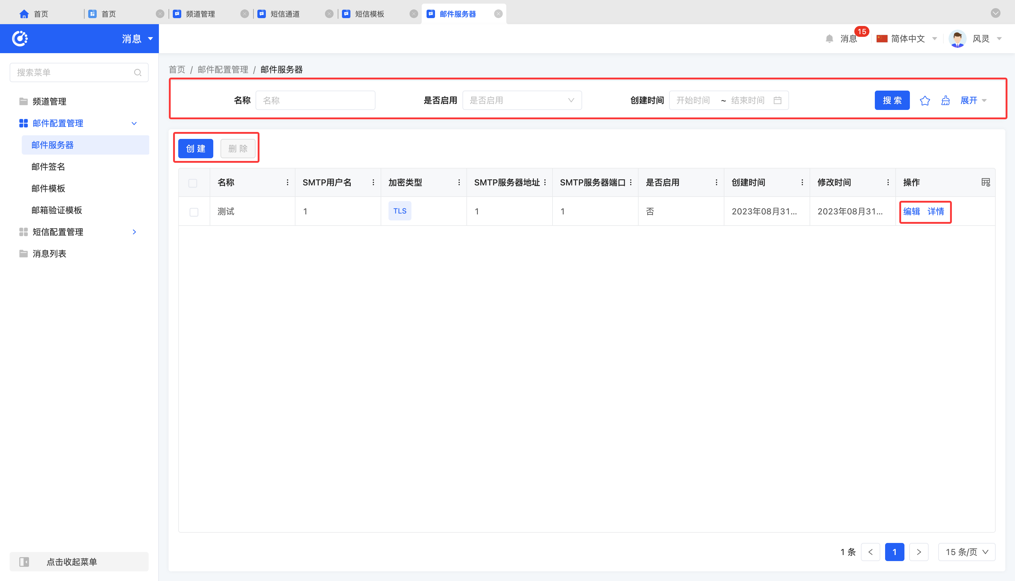 - 添加:点击「创建」,输入所需的配置信息并保存,即可成功创建新的短信通道。