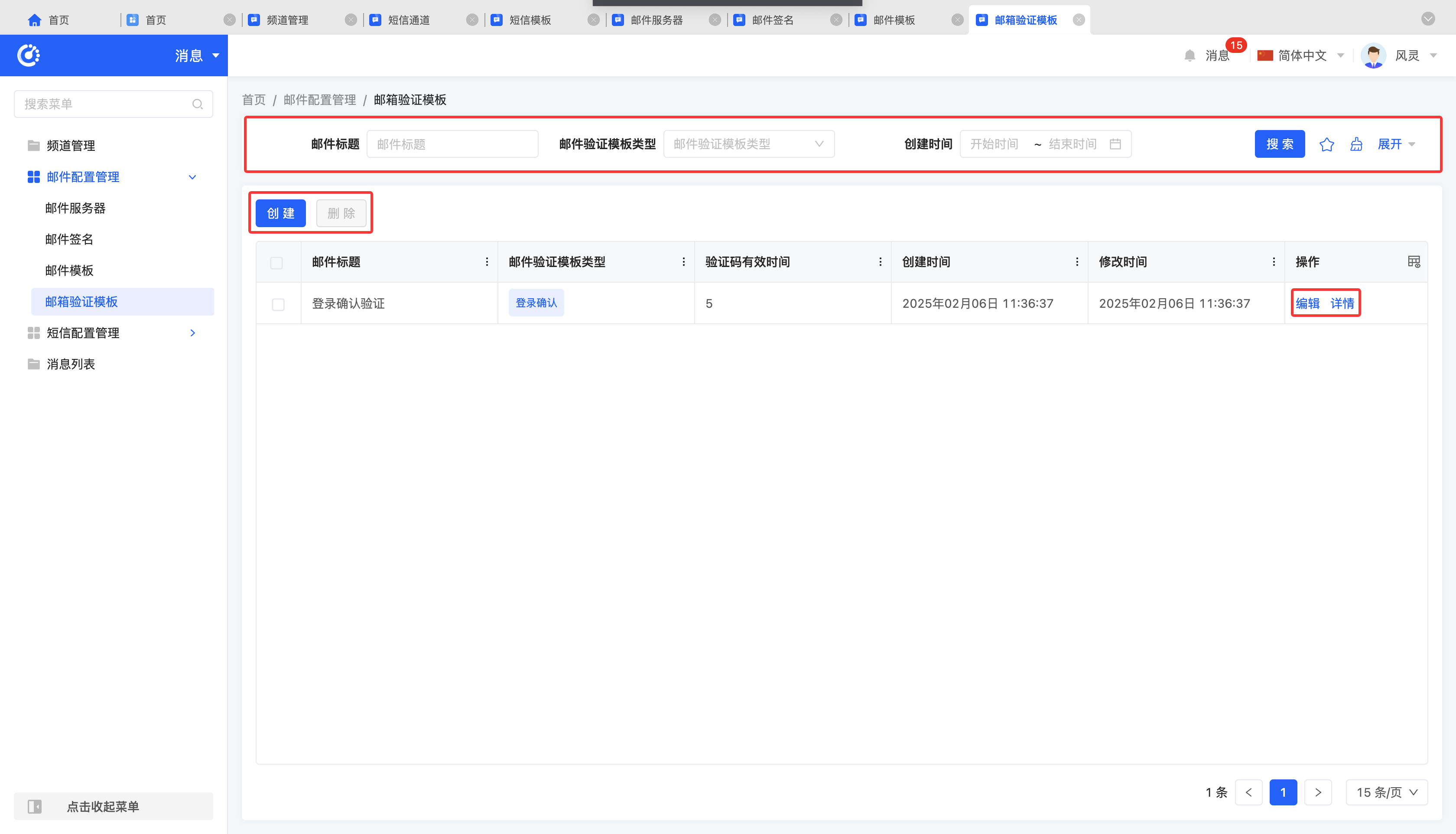 - 添加:点击「创建」,输入所需的配置信息并保存,即可成功创建新的邮件验证模板。
