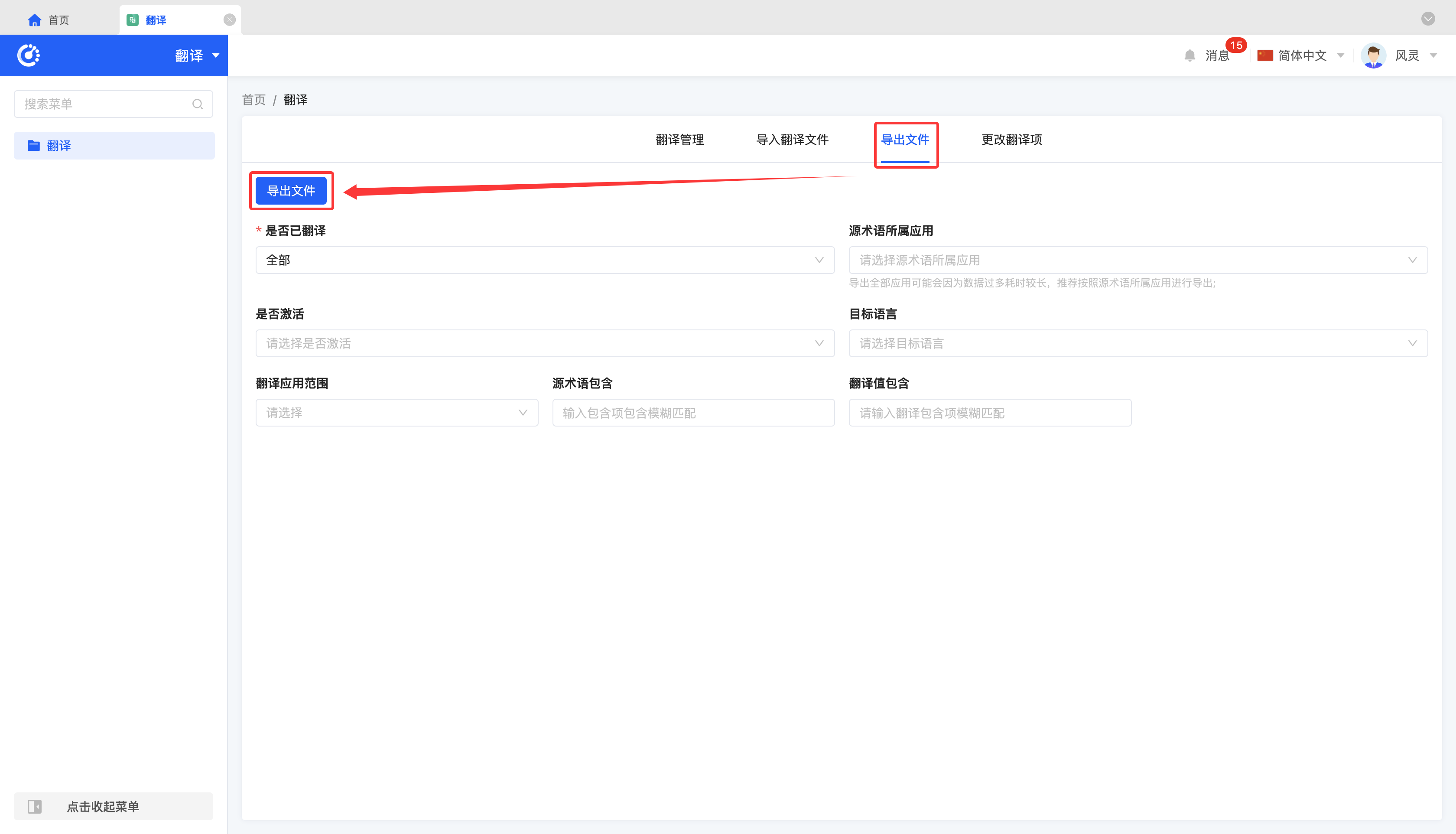 填写需要导出的翻译项的信息后,点击「导出文件」,即可成功导出