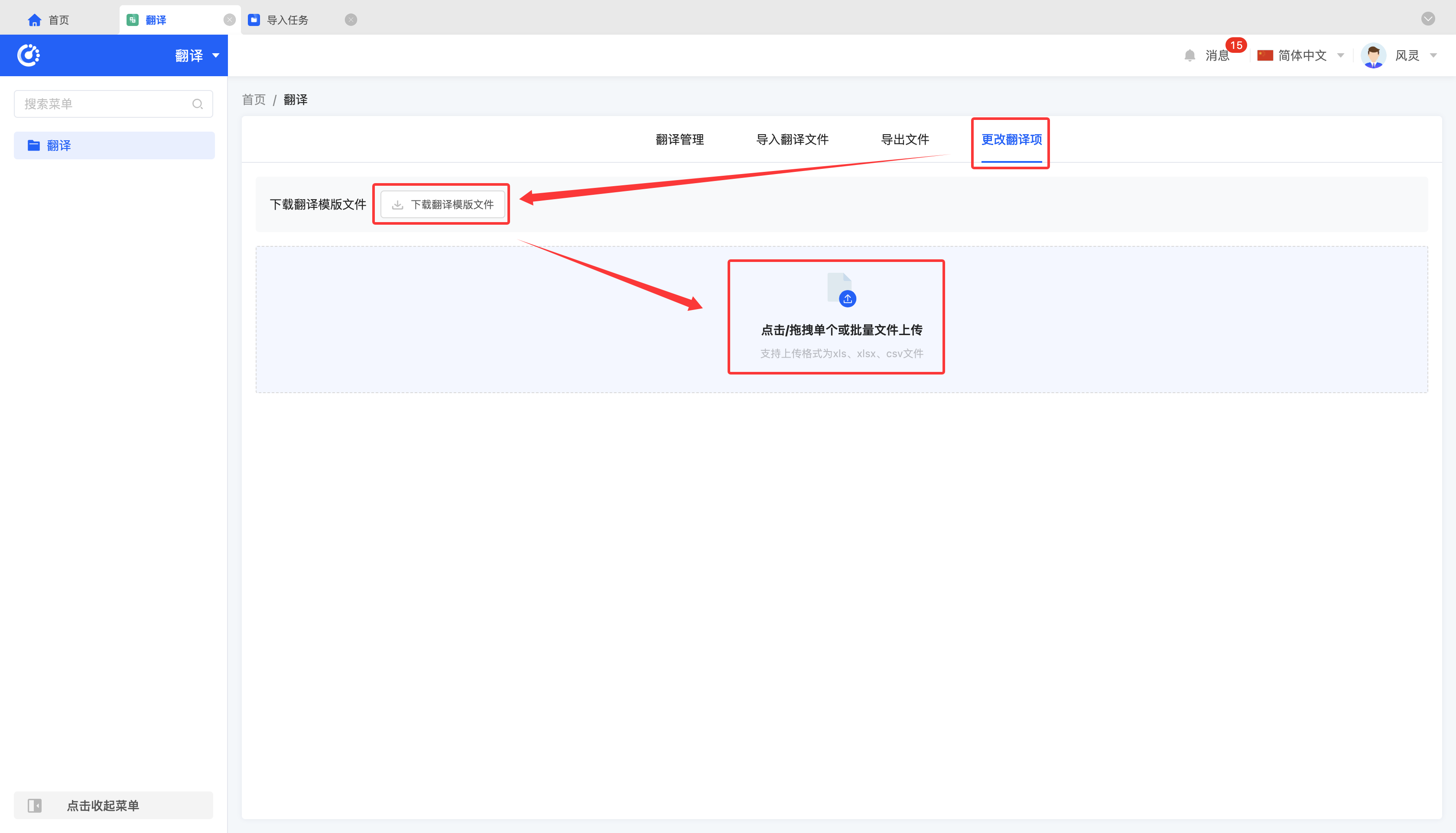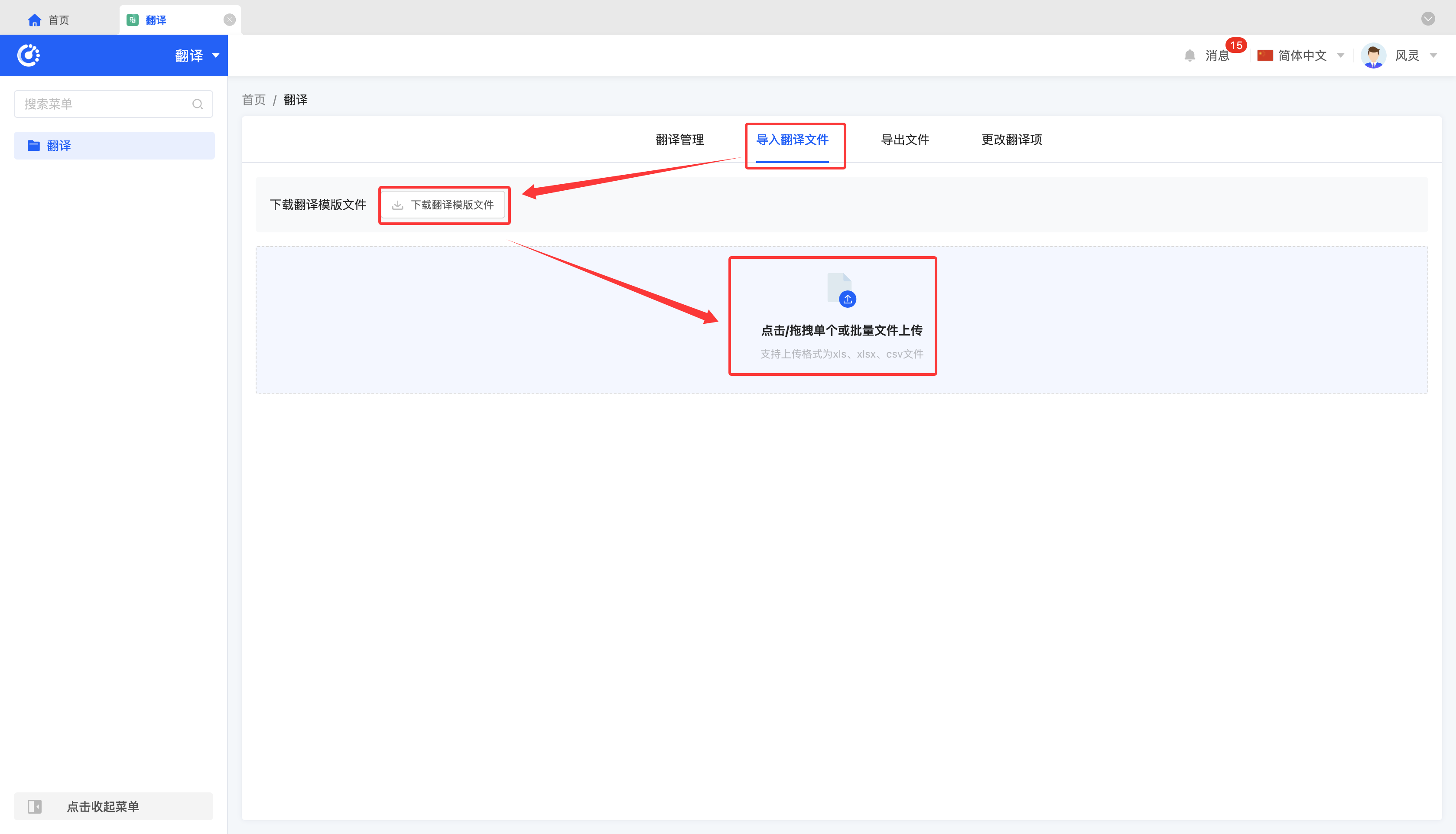 点击「下载翻译模板文件」,填写完毕后进行上传即可成功导入