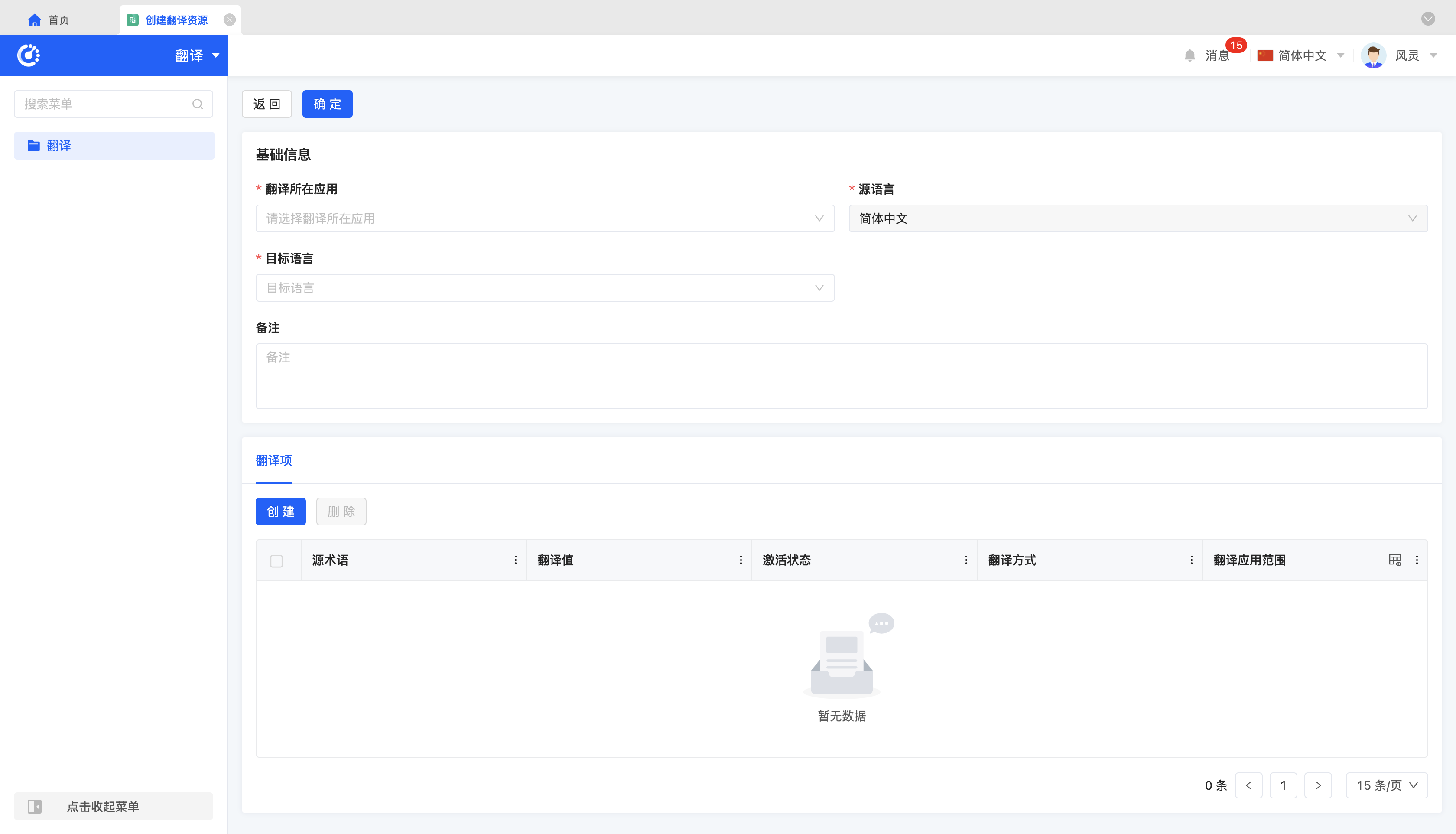 - 创建:点击「创建」,输入所需的配置信息及翻译项的相关信息,即可成功创建新的翻译项。